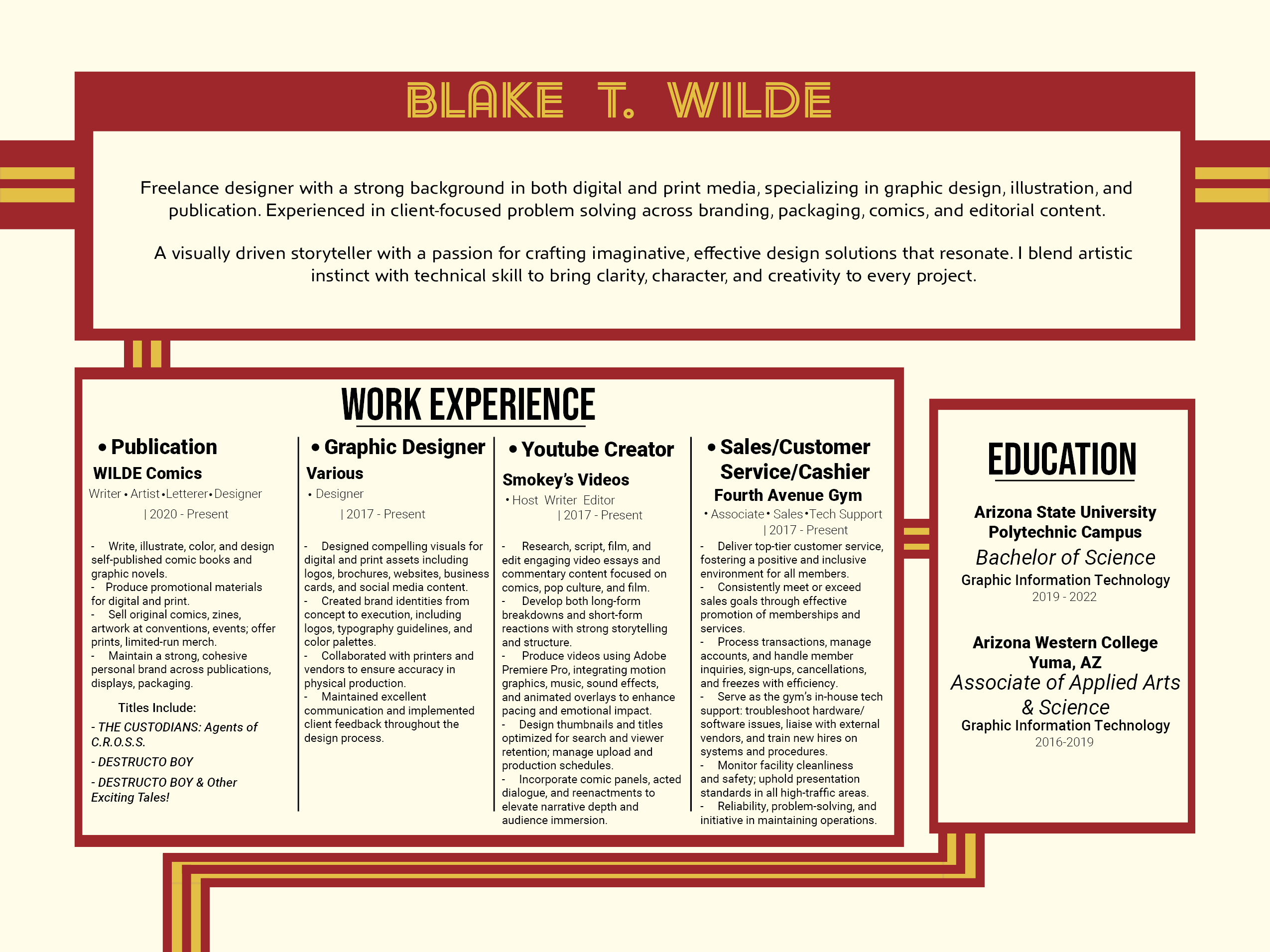 Blake T. Wilde is a graphic designer, cartoonist, and comic book creator from Yuma, AZ. Books include DESTRUCTO BOY & OTHER EXCITING TALES, DESTRUCTO BOY, and The Custodians: Agents of C.R.O.S.S.